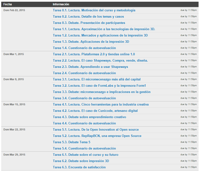 Los contenidos son adaptaciones de los casos que de forma regular he ido posteando en este blog. En todo caso los tendréis en abierto en breve. Creo que la figura de un hilo conductor atractivo como es la impresión 3D ha animado a los estudiantes de ingeniería de la UPC a adentrarse en temas de gestión empresarial y emprendimiento, y a estudiantes de empresa a buscar oportunidades de negocio en el ámbito de la tecnología. Tal vez este enfoque no sería válido en un curso de niveles avanzados, pero sí en este introductorio tanto a la empresa como a la tecnología, mercados y aplicaciones sobre la impresión aditiva