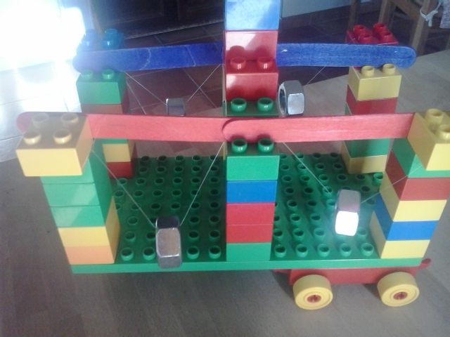 - Con una base de piezas de Lego, bloques de madera, una garrafa plástica de agua de 5l o una mesa y cinta adhesiva, hilo de pescar, un palo que atraviesa (de helado o un lápiz, mejor que se pueda enroscar) y tres o cuatro tuercas de metal pueden construir un señor péndulo.