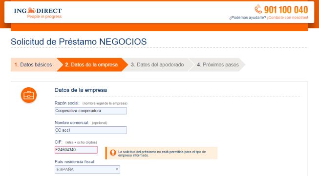 La solicitud de préstamo no está permitida para el tipo de empresa informado.